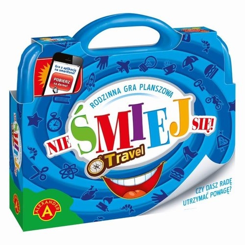 Nie smiej się! Travel : rodzinna gra planszowa. - Chwaszczyno k/Gdyni : Aleksander, [2018]. - 1 gra (1 plansza do gry, 1 kolorowa kostka, 110 kart z hasłami, 8 pionków, 1 klepsydra, 1 kamień celtycki, 1 nos klauna, instrukcja) : karton, tektura, plastik, kolor ; w pudełku 20x14x3 cm + instrukcja (3 strony : ilustracje ; 15 cm).